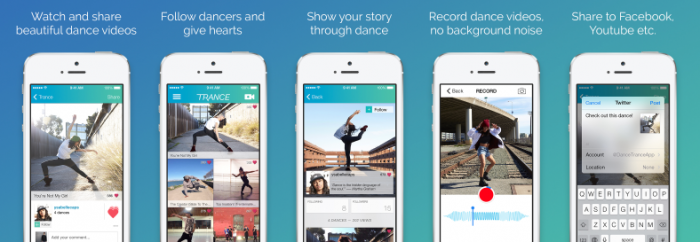 The app showcases 9 new dances every day, and allows users to follow artists and “heart” performances they like. Trance makes it easy to record dances up to 1 minute long through the app and share on other social networks.